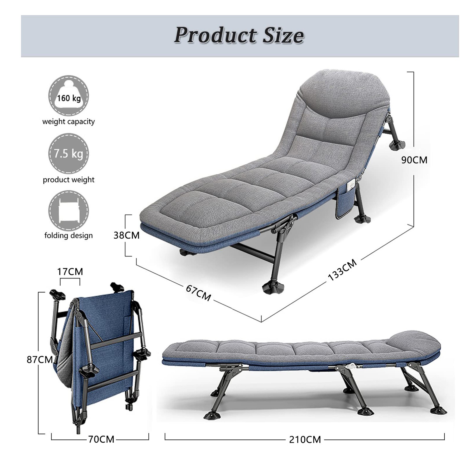 5. 便携式可折叠日光躺椅:躺椅长 210 厘米,宽 67 厘米,高 38 厘米。折叠后便于携带,尺寸约为 87 x 70 x 17 厘米,重 7.5 公斤,最大