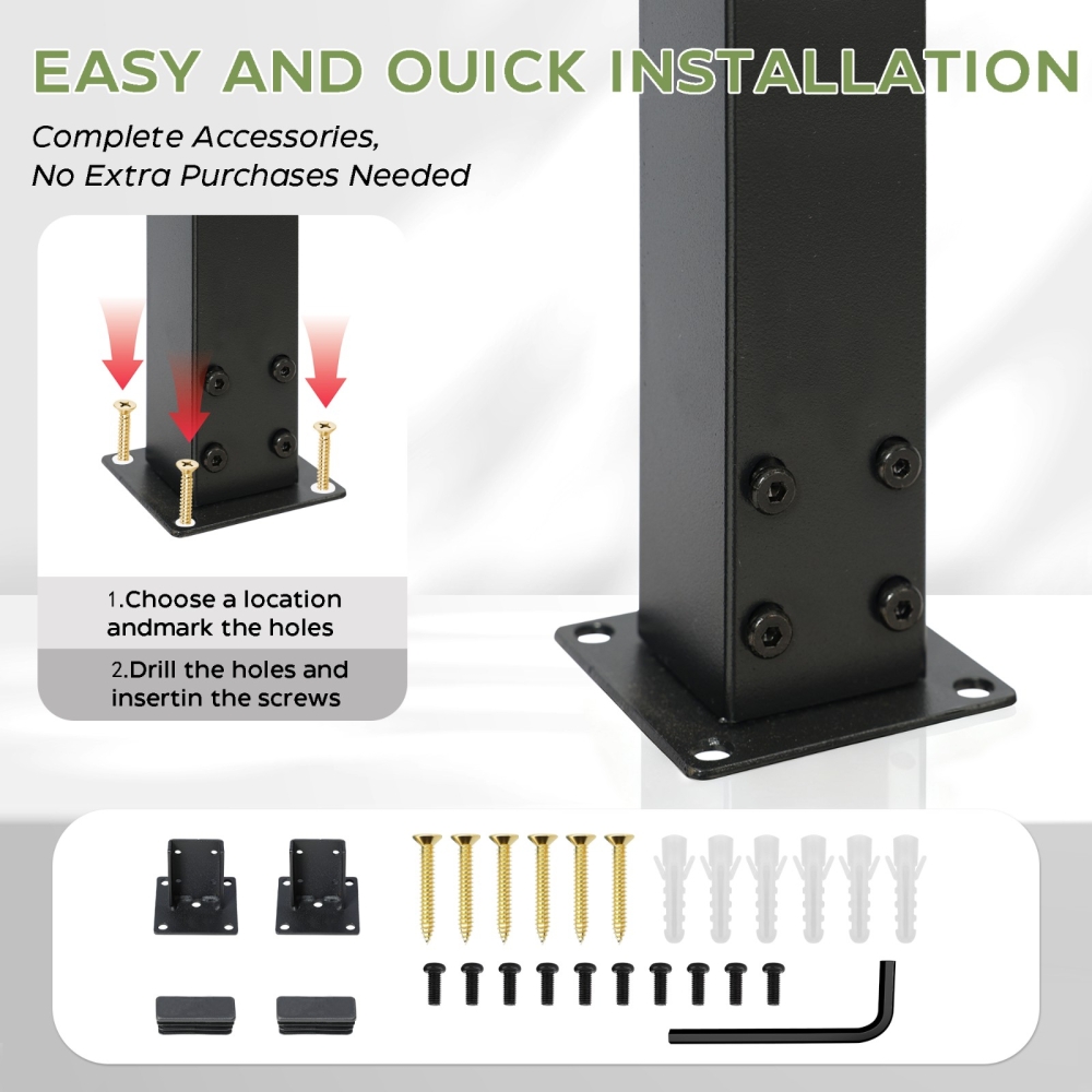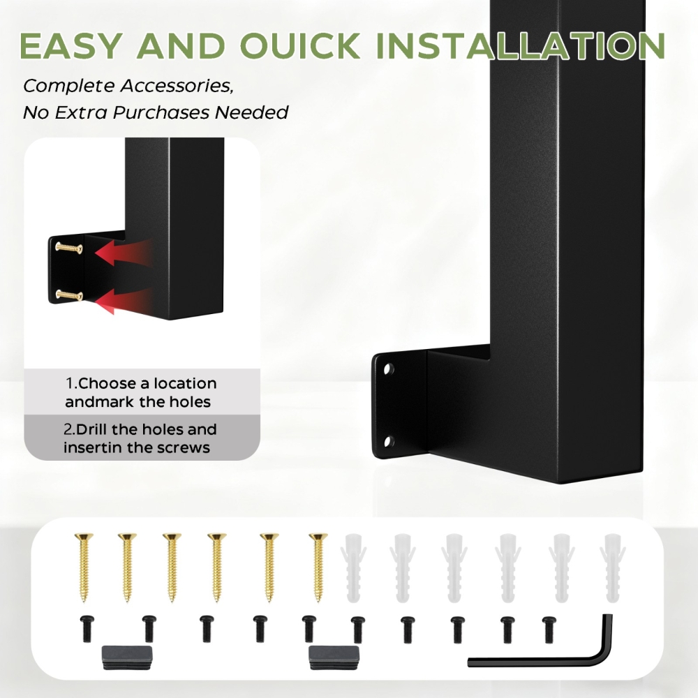 【安装简便】楼梯扶手包含所有必要的部件和详细易懂的安装说明。配件包括:膨胀螺栓、扳手和螺丝。只需连接各个部件,选择合适的安装位置,