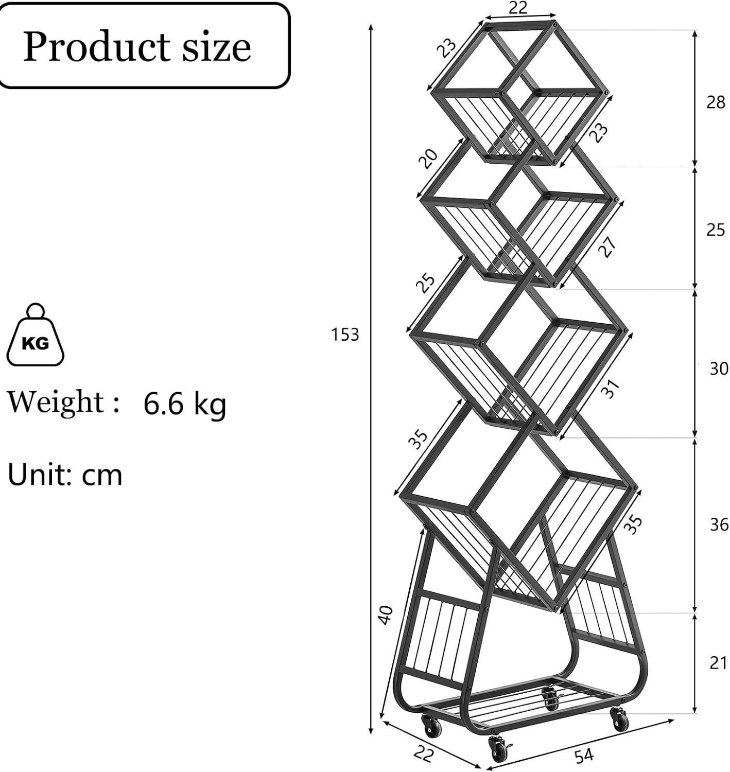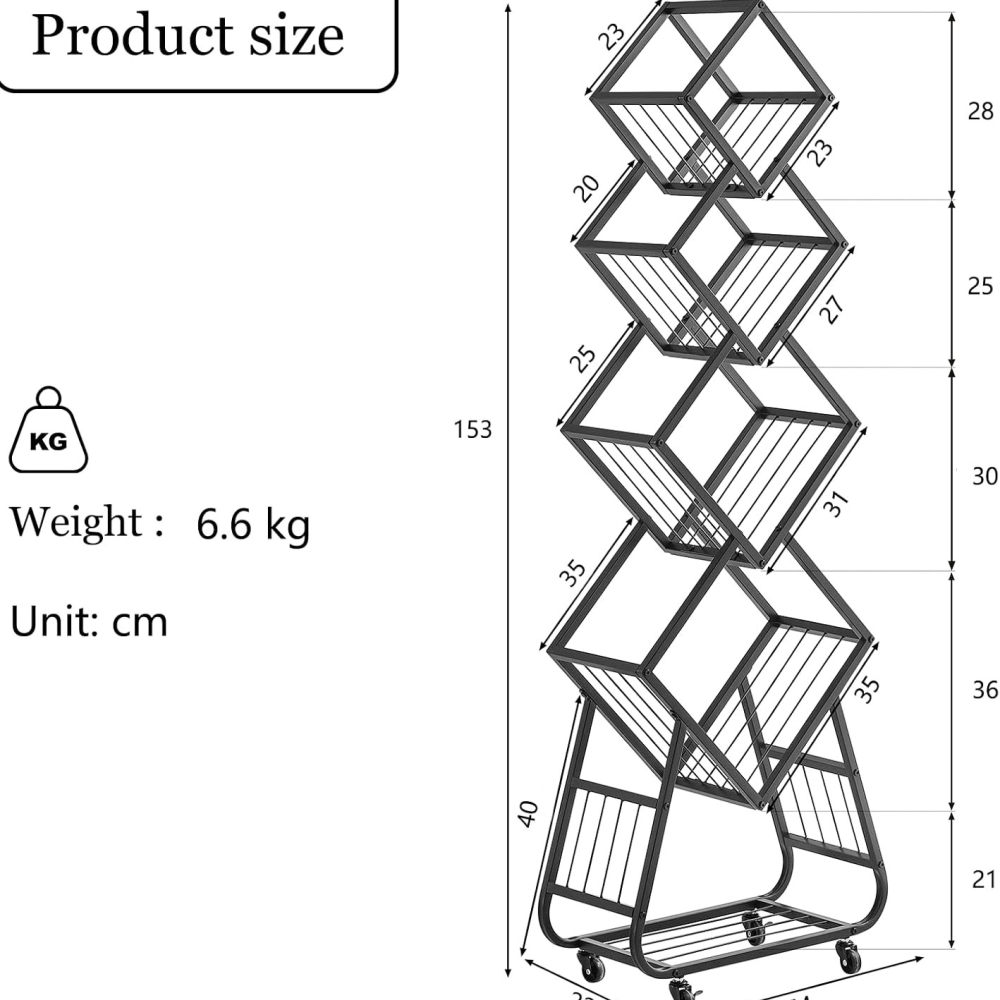 节省空间:这款A4宣传册架占地极小,却配备5层搁板,充分利用有限空间。书架配备滚轮便于移动。整体尺寸:54 x 22 x 153厘米。