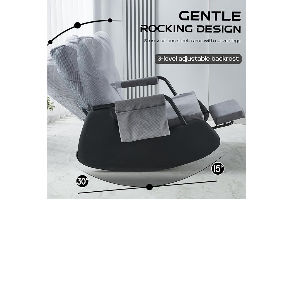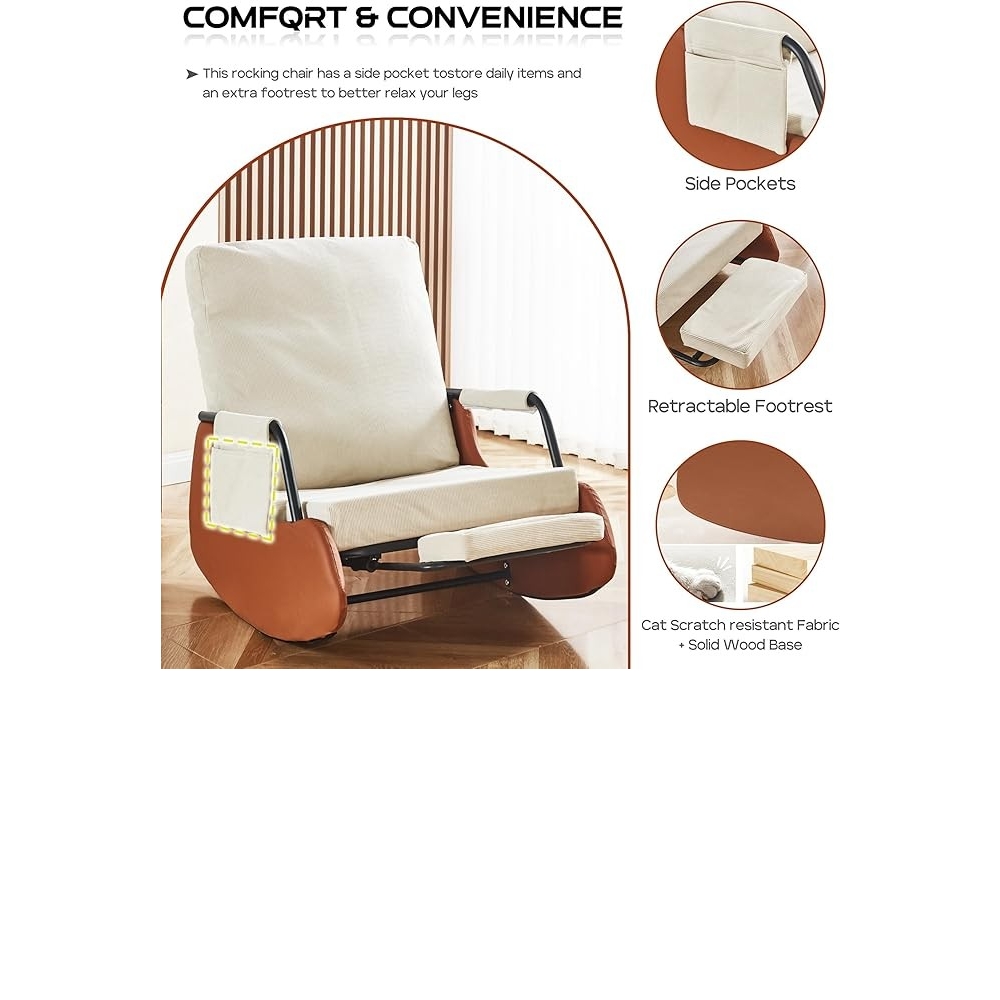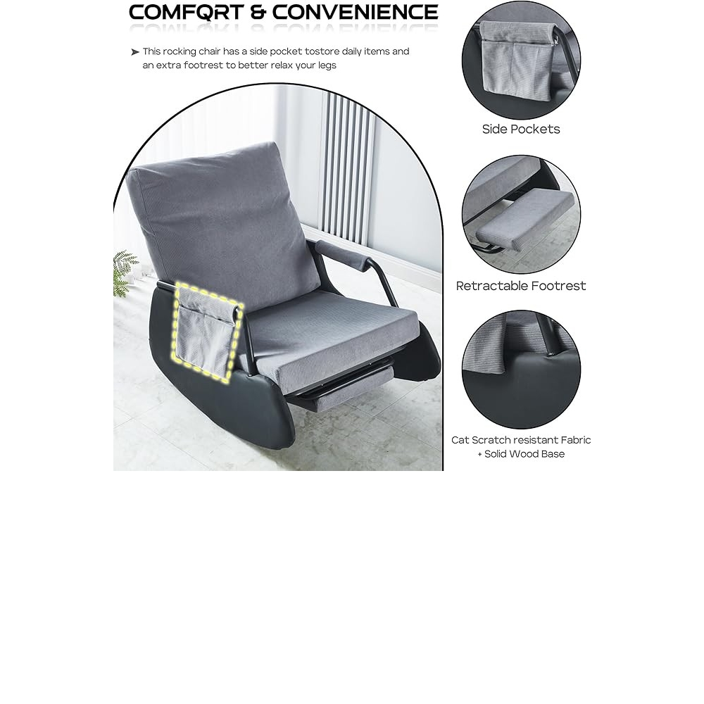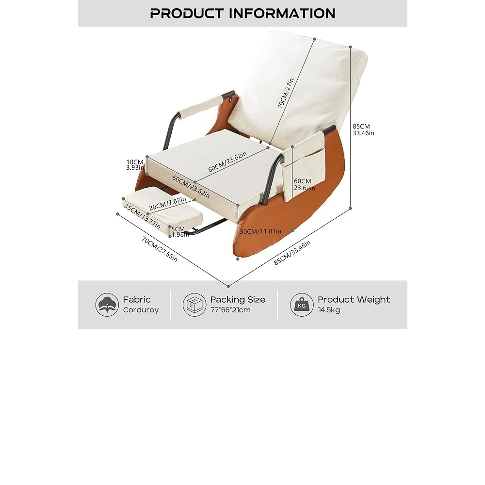 【柔软舒适】厚实的填充物和高弹填充确保了摇椅的舒适度,使其成为客厅摇椅的理想之选。耐用且功能齐全的面料柔软舒适,