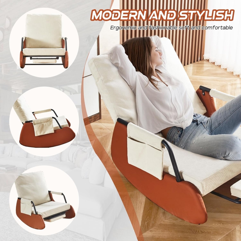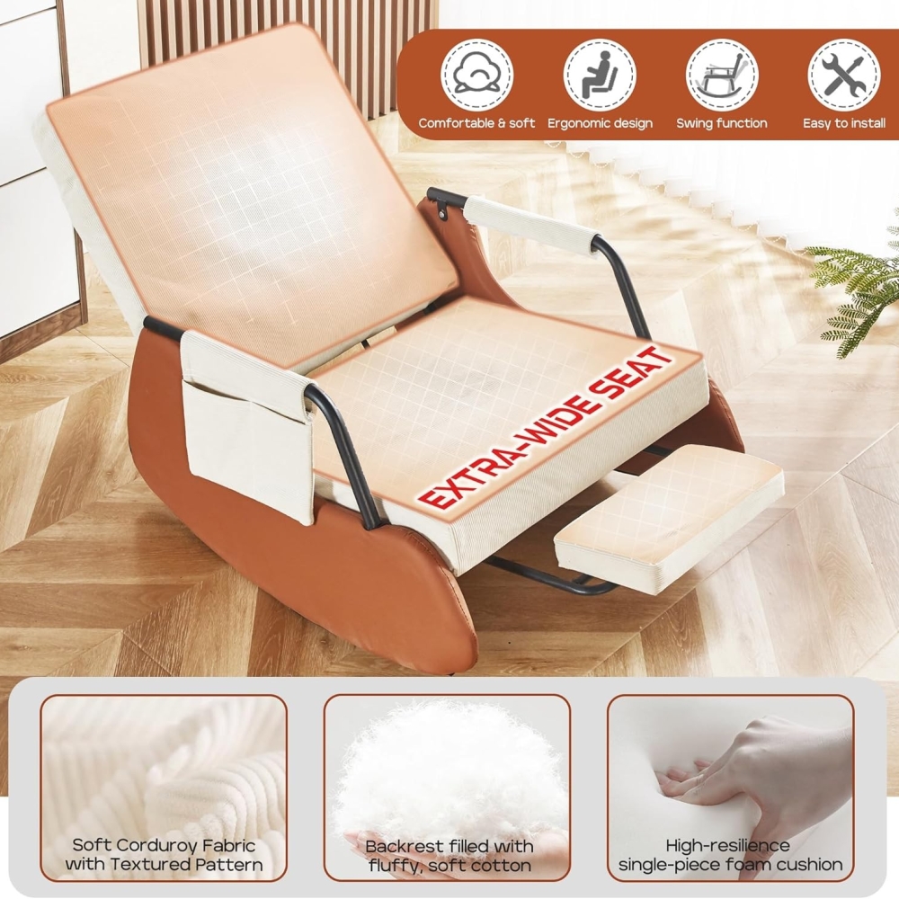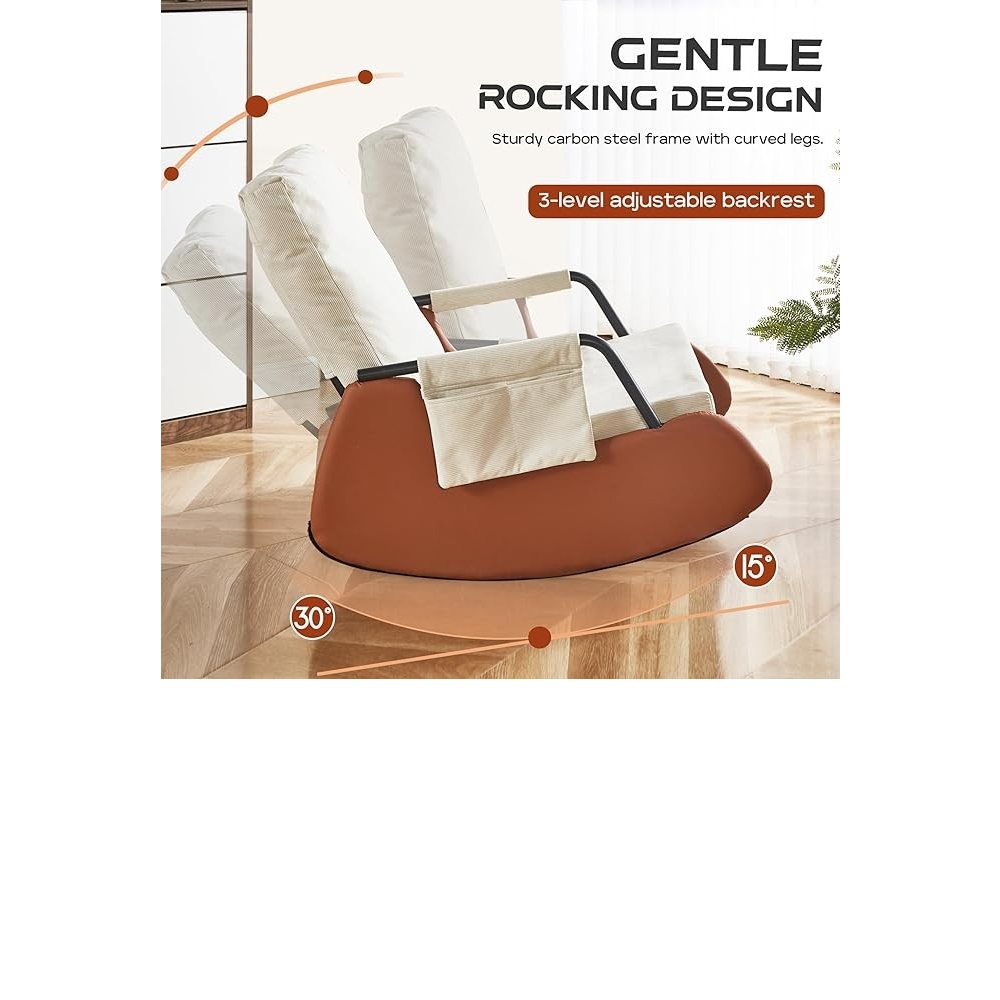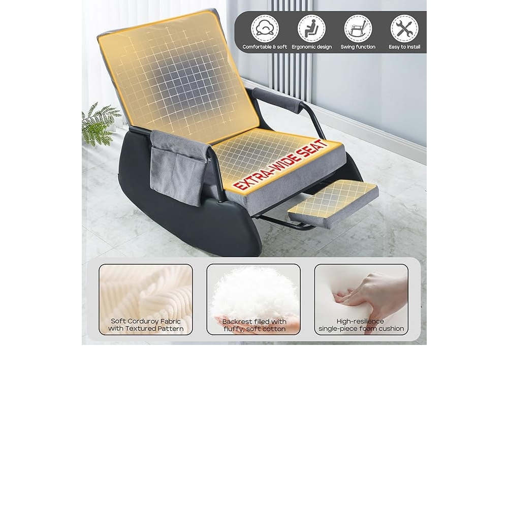 【柔软舒适】厚实的填充物和高弹填充确保了摇椅的舒适度,使其成为客厅摇椅的理想之选。耐用且功能齐全的面料柔软舒适,
