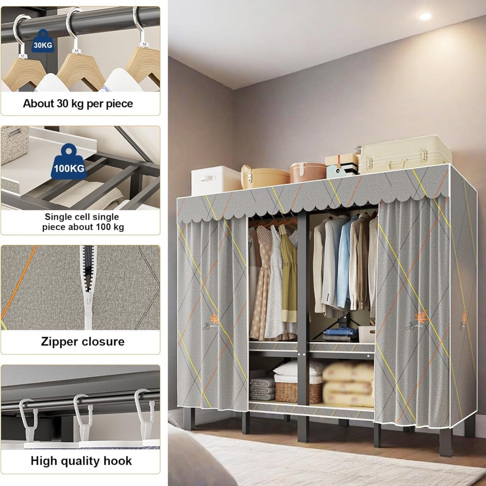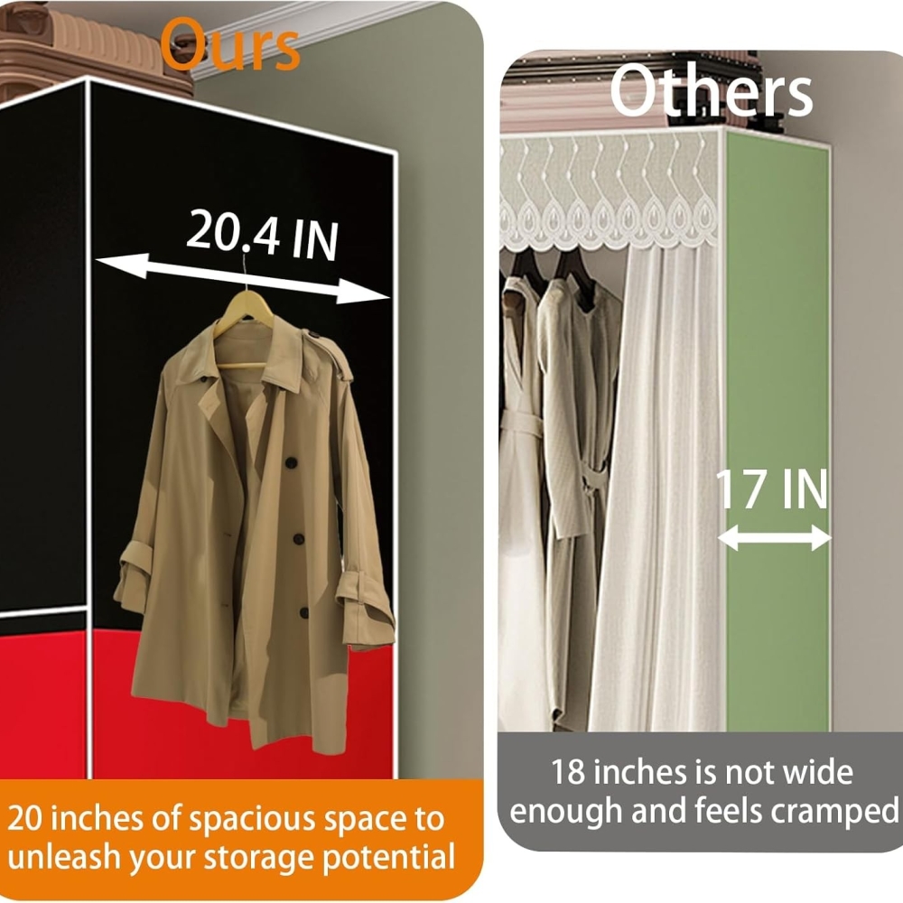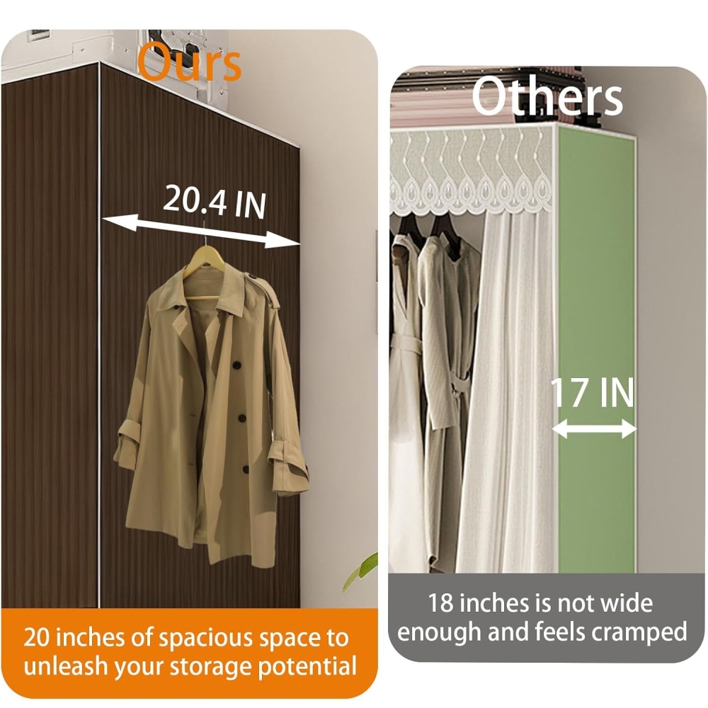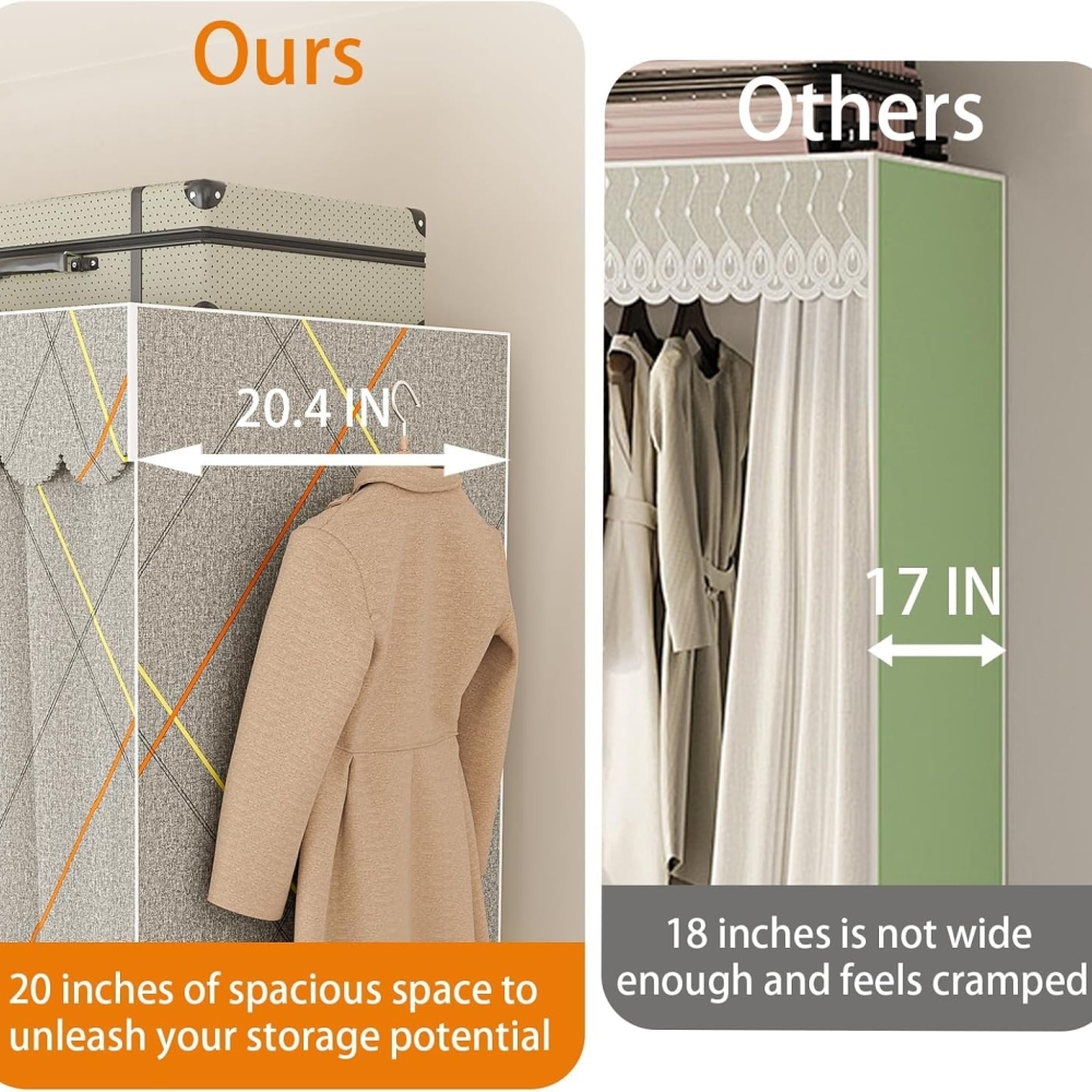【带盖衣架】便携式衣柜。我们的衣柜可折叠,无需工具即可轻松安装,方便收纳。其坚固的框架稳定不易变形,是租房者、宿舍、公寓、搬