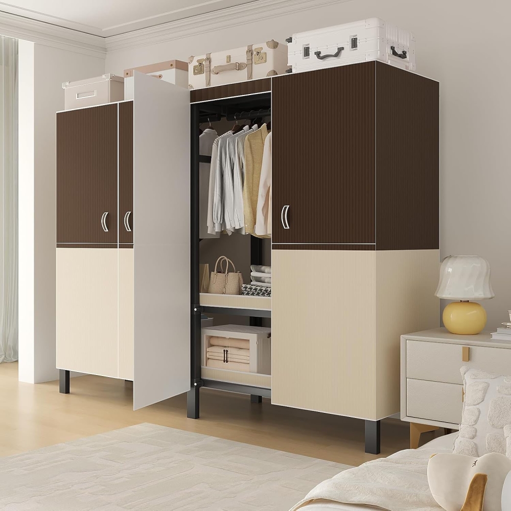 【独立式衣柜】带盖衣架。两层大隔板可存放折叠衣物,两根挂杆每根承重高达 80 磅,可悬挂连衣裙、西装和外套,底部空间可放置鞋子,