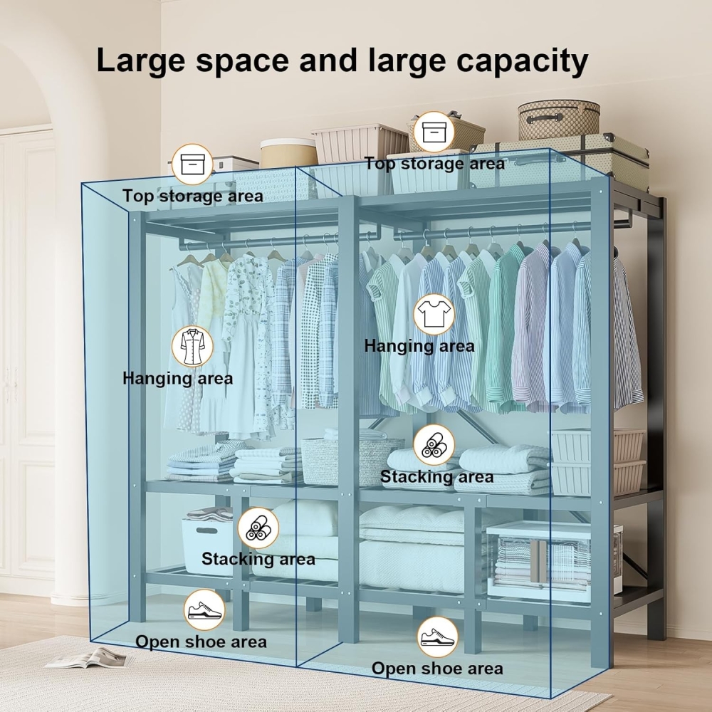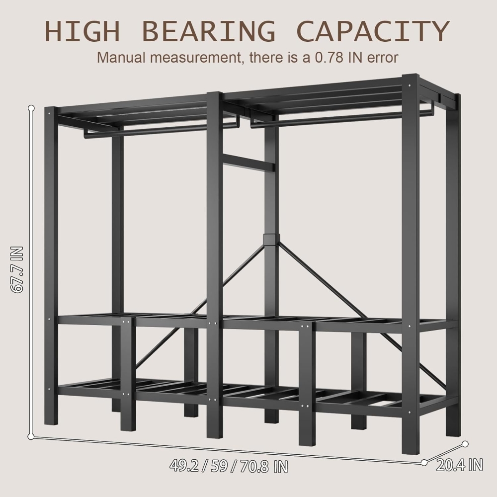 【带盖便携式衣柜】大容量便携式衣柜。采用30mm加固钢管和哑光粉末涂层,坚固耐用,防刮擦。总承重高达1000磅,为您的所有衣物收纳