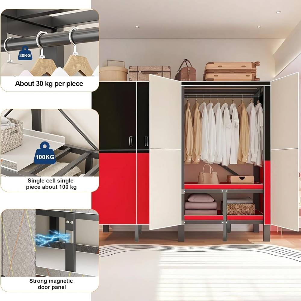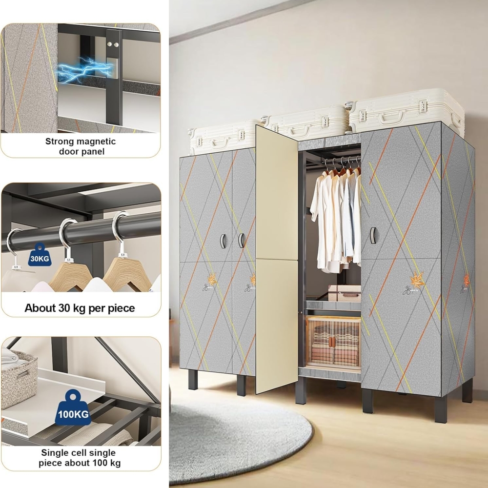 【磁吸门,灵活调节】带盖衣架。保护您的衣物免受灰尘和损坏。每扇门都配有磁铁,可牢固闭合,连接扣可让您通过打开单个门板灵活取用衣物。